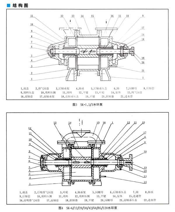 填料安裝在兩端蓋內,密封水經由端蓋中的小孔進入填料中,冷卻填料及加強密封效果。葉輪形成水環所需的補充水由供水管供給,供水管可與氣水分離器連在一起循環供水。