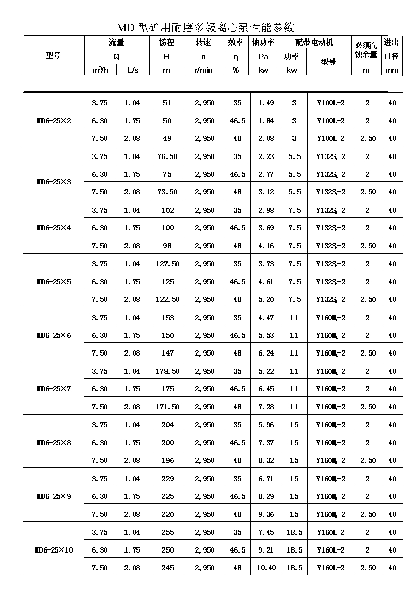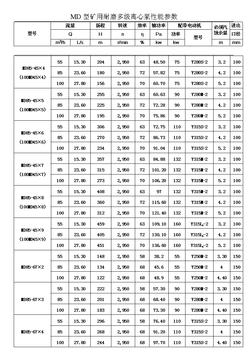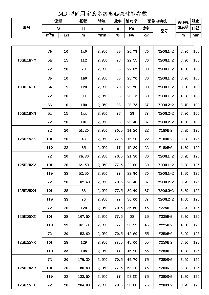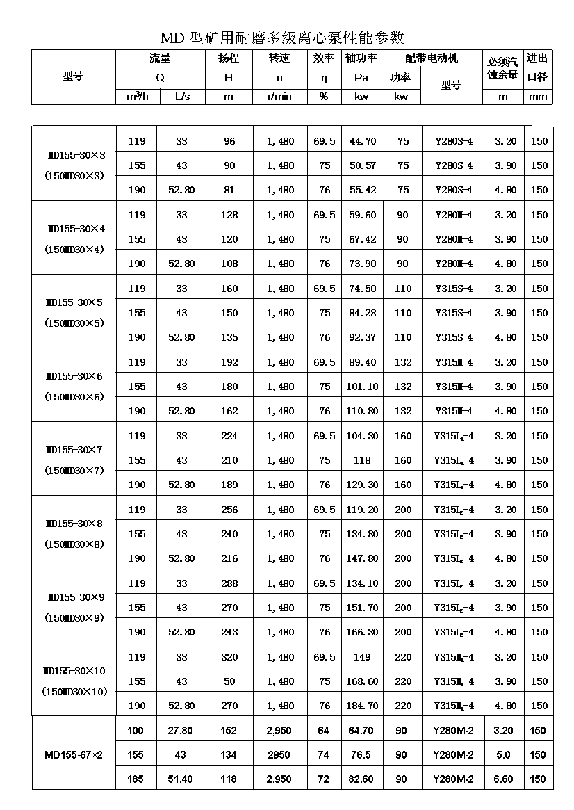 MD型耐磨多級離心泵,是我公司在D型單吸多級清水離心泵的基礎上,改造設計的一種耐磨多級離心泵。MD型耐磨多級離心泵,高效節能,耐磨可靠,壽命長, 特別適用于礦山排水,抽送固體顆粒含量不大于1.5%(顆粒直徑小于0.5毫米)的礦井水及其他類似液體,液體溫度不高于80度。