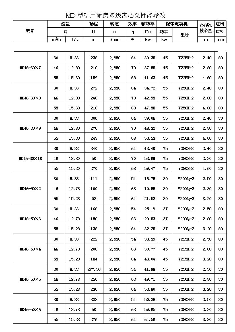 注:D(DF多級耐腐蝕離心泵、DY多級離心油泵、MD多級耐磨離心泵)80-30為習慣表示方法,其中80表示泵吸入口直徑為80mm,30表示泵設計點單級揚程為30m,其它含義與上述表示方法相同。