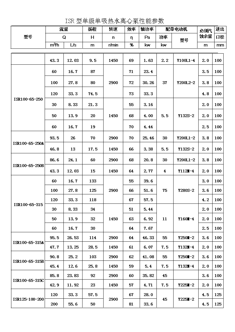 ISR系列單級單吸熱水離心泵共有二十九種基本型,為滿足用戶對泵的不同性能要求,我廠采用了切割葉輪外徑的方法,從而增多了ISR泵的規(guī)格。